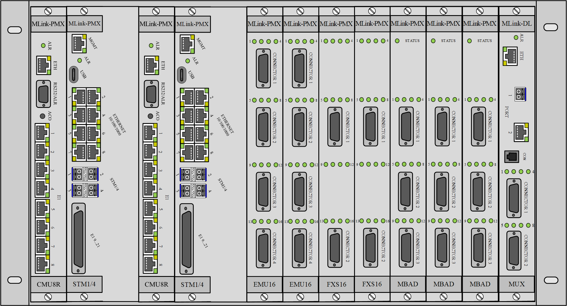 Универсальный мультиплексор MLink-PMX предназначен для применения на сети связи общего пользования или технологической сети связи в качестве оборудования цифровых систем передачи плезиохронной и синхронной цифровых иерархий с функциями коммутации пакетов информации сетей передачи данных. Универсальный мультиплексор MLink-PMX предназначен для формирования агрегатных цифровых сигналов электросвязи каналообразующего оборудования синхронной цифровой иерархии, плезиохронной цифровой иерархии и выполнения функций коммутации пакетов информации.